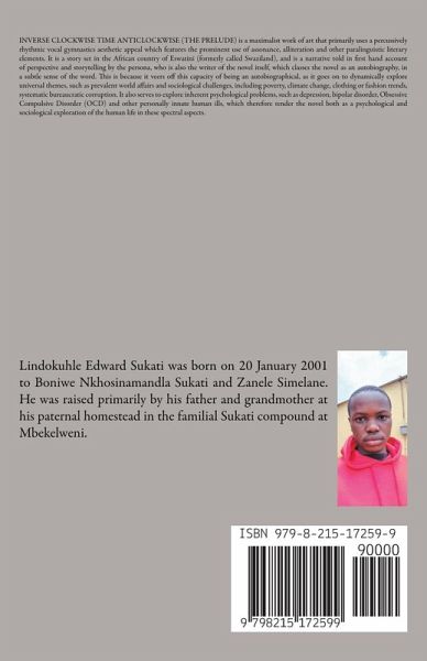 INVERSE CLOCKWISE TIME ANTICLOCKWISE (THE PRELUDE) is a maximalist work of art that primarily uses a percussively rhythmic vocal gymnastics aesthetic appeal which features the prominent use of assonance, alliteration and other paralinguistic literary elements. It is a story set in the African country of Eswatini (formerly called Swaziland), and is a narrative told in first hand account of perspective and storytelling by the persona, who is also the writer of the novel itself, which classes the novel as an autobiography, in a subtle sense of the word. This is because it veers off this capacity of being an autobiographical, as it goes on to dynamically explore universal themes, such as prevalent world affairs and sociological challenges, including poverty, climate change, clothing or fashion trends, systematic bureaucratic corruption. It also serves to explore inherent psychological problems, such as depression, bipolar disorder, Obsessive Compulsive Disorder (OCD) and other personally innate human ills, which therefore render the novel both as a psychological and sociological exploration of the human life in these spectral aspects.
