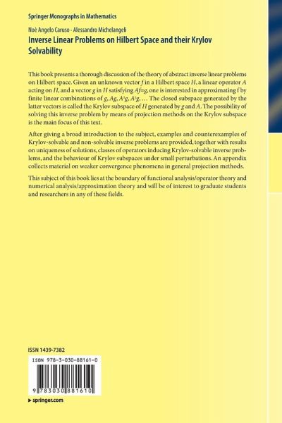This book presents a thorough discussion of the theory of abstract inverse linear problems on Hilbert space. Given an unknown vector f in a Hilbert space H, a linear operator A acting on H, and a vector g in H satisfying Af=g, one is interested in approximating f by finite linear combinations of g, Ag, A2g, A3g, ... The closed subspace generated by the latter vectors is called the Krylov subspace of H generated by g and A. The possibility of solving this inverse problem by means of projection methods on the Krylov subspace is the main focus of this text.