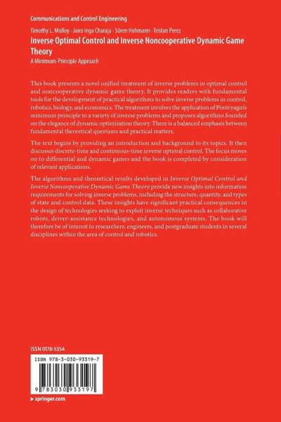 This book presents a novel unified treatment of inverse problems in optimal control and noncooperative dynamic game theory. It provides readers with fundamental tools for the development of practical algorithms to solve inverse problems in control, robotics, biology, and economics. The treatment involves the application of Pontryagin's minimum principle to a variety of inverse problems and proposes algorithms founded on the elegance of dynamic optimization theory. There is a balanced emphasis between fundamental theoretical questions and practical matters.