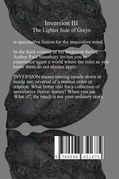 Inversion III - The Lighter Shades of Greys is the third volume of Author Paul Stansbury's Inversion Series. In these stories, you will again experience a world where the rules as you know them do not always apply. As you might guess from the title of this volume, the stories deal in some fashion with beings from other worlds. There may be one or two characters you will encounter whose origins may be in question, but take it from me, they are not from this neck of the woods. If you are looking for creepy alien abduction yarns, these stories are not for you. Nor will you find cataclysmic invasions of vicious, flesh eating space monsters on the menu. As the subtitle for this volume indicates, these stories are on the lighter side perhaps even humorous. The beings you will encounter here are most certainly of a kinder, gentler variety, although not too sweet.