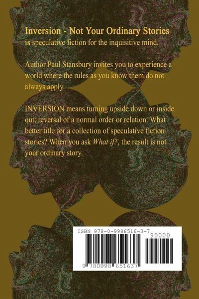 Inversion - Not Your Ordinary Stories is speculative fiction for the inquisitive mind. Author Paul Stansbury invites you to experience a world where the rules as you know them do not always apply. Inversion means turning upside down or inside out, reversal of a normal order or relation. What better title for a collection of speculative fiction stories? When you ask "What If?". the result is not your ordinary story.