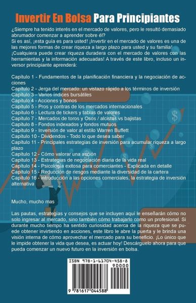 ¿Siempre ha tenido interés en el mercado de valores, pero le resultó demasiado abrumador comenzar a aprender sobre él? Si es así, ¡esta guía es para usted! ¡Invertir en el mercado de valores es una de las mejores formas de crear riqueza a largo plazo para usted y su familia! ¡Cualquiera puede crear riqueza duradera con el mercado de valores con las herramientas y la información adecuadas! A través de este libro, incluso un inversor principiante aprenderá: Capítulo 1 - Fundamentos de la planificación financiera y la negociación de acciones Capítulo 2 - Jerga del mercado: un vistazo rápido a los términos de inversión Capítulo 3 - Varios índices bursátiles Capítulo 4 - Acciones y bonos Capítulo 5 - Pros y contras de los mercados internacionales Capítulo 6 - Lectura de tickers y tablas de valores Capítulo 7 - Mercados de toros y Osos / alcistas vs bajistas Capítulo 8 - Fondos indexados y fondos mutuos Capítulo 9 - Inversión de valor al estilo Warren Buffett Capítulo 10 - Dividendos - Todo lo que desea saber Capítulo 11 - Principales estrategias de inversión para acumular riqueza a largo plazo Capítulo 12 - Cómo valorar una acción Capítulo 13 - Estrategias de negociación diaria de la vida real Capítulo 14 - Psicología exitosa para comerciantes - Explicada en detalle Capítulo 15 - Reducción de riesgos mediante la diversidad de la cartera Capítulo 16 - Introducción a las opciones comerciales, la estrategia de inversión alternativa Mucho, mucho mas Las pautas, estrategias y consejos que se incluyen aquí le enseñarán cómo no solo ingresar al mercado, sino también cómo trabajarlo como un profesional. Si durante mucho tiempo ha sentido curiosidad acerca de la riqueza que se puede obtener invirtiendo en acciones, este audiolibro le abre la puerta y le brinda una visión interna de cómo aprovechar el mercado para su beneficio. ¡Lo único que le impide obtener la vida que desea, es actuar hoy! Descárguelo ahora para que pueda comenzar un nuevo futuro en la inversión en bolsa.