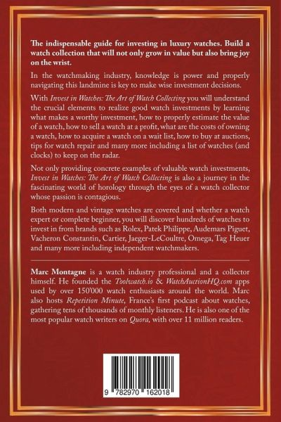 The indispensable guide for investing in luxury watches. Build a watch collection that will not only grow in value but also bring joy on the wrist. According to Bloomberg, multiple luxury watches have outperformed vintage cars, Bitcoin and other crypto currencies in 2022. Market prices for some Rolex, Patek Philippe, Vacheron Constantin and Audemars Piguet references have more than doubled over the past two years and auction records keep being set month after month. In the watchmaking industry, knowledge is power and properly navigating this landmine is key to make wise investment decisions. With Invest in Watches: The Art of Watch Collecting you will understand the crucial elements to realize good watch investments by learning what makes a worthy investment, how to properly estimate the value of a watch, how to sell a watch at a profit, what are the costs of owning a watch, how to acquire a watch on a wait list, how to buy at auctions, tips for watch repair and many more including a list of watches (and clocks) to keep on the radar. Not only providing concrete examples of valuable watch investments, Invest in Watches: The Art of Watch Collecting is also a journey in the fascinating world of horology through the eyes of a watch collector whose passion is contagious. Both modern and vintage watches are covered and whether a watch expert or complete beginner, you will discover hundreds of watches to invest in from brands such as Rolex, Patek Philippe, Audemars Piguet, Vacheron Constantin, Cartier, Jaeger-LeCoultre, Omega, Tag Heuer and many more including independent watchmakers. "Investors who earned big returns in tech stocks and crypto currencies are now looking to pre-owned watches as the next hot asset class". -Bloomberg "A great read and strongly recommended for those interested in taking their luxury watch collecting to the next level and unpacking the booming trading value of select pieces." -Teddy Baldassarre "Don't ask me which watch to buy, just go get the book!" -Andrea Casalegno, IamCasa "Rarely have I been so enthusiastic about a book. It has a clear and understandable structure and is well researched and prepared. You can feel the passion for watches in every line - on every page - beware of the risk of addiction." -Karl Heinz Nuber, Tourbillon Magazine "This book is the perfect guide for understanding how to invest wisely in watches. It's also simply a lot of fun and super interesting to read for anyone who loves watchmaking." -Alex G, editor of madeinbienne.ch Marc Montagne is a watch industry professional and a collector himself. He founded the Toolwatch.io & WatchAuctionHQ.com apps used by over 160'000 watch enthusiasts around the world. Marc also hosts Repetition Minute, France's first podcast about watches, gathering tens of thousands of monthly listeners. He is also one of the most popular watch writers on Quora, with over 12 million readers.