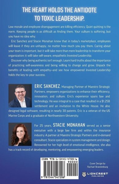 The heart holds the antidote to toxic leadership. Low morale and employee disengagement are killing efficiency. Quiet quitting is the norm. Keeping people is as difficult as finding them. Your culture is suffering, but you have no idea why. Eric Sanchez and Stacie Monahan know that in today's marketplace, employees will leave if they are unhappy, no matter how much you pay them. Caring about your team is important, but it will take more than mere leadership to transform your organization; it will take self-aware, empathetic Invested Leadership. Discover why being authentic isn't enough. Learn hard truths about the importance of practicing self-awareness and being willing to change and grow. Unpack the benefits of leading with empathy-and see how empowered Invested Leadership holds the key to your success.