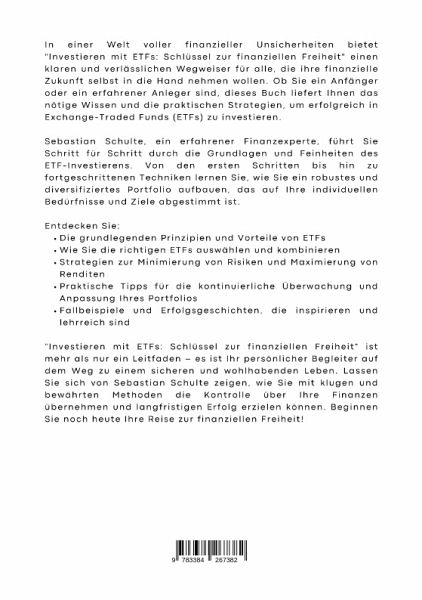 In einer Welt voller finanzieller Unsicherheiten bietet "Investieren mit ETFs: Schlüssel zur finanziellen Freiheit" einen klaren und verlässlichen Wegweiser für alle, die ihre finanzielle Zukunft selbst in die Hand nehmen wollen. Ob Sie ein Anfänger oder ein erfahrener Anleger sind, dieses Buch liefert Ihnen das nötige Wissen und die praktischen Strategien, um erfolgreich in Exchange-Traded Funds (ETFs) zu investieren.Sebastian Schulte, ein erfahrener Finanzexperte, führt Sie Schritt für Schritt durch die Grundlagen und Feinheiten des ETF-Investierens. Von den ersten Schritten bis hin zu fortgeschrittenen Techniken lernen Sie, wie Sie ein robustes und diversifiziertes Portfolio aufbauen, das auf Ihre individuellen Bedürfnisse und Ziele abgestimmt ist.Entdecken Sie:- Die grundlegenden Prinzipien und Vorteile von ETFs- Wie Sie die richtigen ETFs auswählen und kombinieren- Strategien zur Minimierung von Risiken und Maximierung von Renditen- Praktische Tipps für die kontinuierliche Überwachung und Anpassung Ihres Portfolios- Fallbeispiele und Erfolgsgeschichten, die inspirieren und lehrreich sind"Investieren mit ETFs: Schlüssel zur finanziellen Freiheit" ist mehr als nur ein Leitfaden - es ist Ihr persönlicher Begleiter auf dem Weg zu einem sicheren und wohlhabenden Leben. Lassen Sie sich von Sebastian Schulte zeigen, wie Sie mit klugen und bewährten Methoden die Kontrolle über Ihre Finanzen übernehmen und langfristigen Erfolg erzielen können. Beginnen Sie noch heute Ihre Reise zur finanziellen Freiheit!