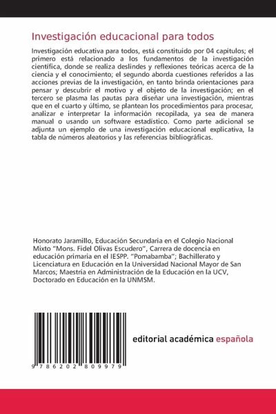 Investigación educativa para todos, está constituido por 04 capítulos; el primero está relacionado a los fundamentos de la investigación científica, donde se realiza deslindes y reflexiones teóricas acerca de la ciencia y el conocimiento; el segundo aborda cuestiones referidos a las acciones previas de la investigación, en tanto brinda orientaciones para pensar y descubrir el motivo y el objeto de la investigación; en el tercero se plasma las pautas para diseñar una investigación, mientras que en el cuarto y último, se plantean los procedimientos para procesar, analizar e interpretar la información recopilada, ya sea de manera manual o usando un software estadístico. Como parte adicional se adjunta un ejemplo de una investigación educacional explicativa, la tabla de números aleatorios y las referencias bibliográficas.