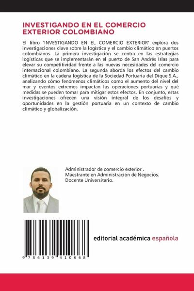 El libro "INVESTIGANDO EN EL COMERCIO EXTERIOR" explora dos investigaciones clave sobre la logística y el cambio climático en puertos colombianos. La primera investigación se centra en las estrategias logísticas que se implementarán en el puerto de San Andrés Islas para elevar su competitividad frente a las nuevas necesidades del comercio internacional colombiano. La segunda aborda los efectos del cambio climático en la cadena logística de la Sociedad Portuaria del Dique S.A., analizando cómo fenómenos climáticos como el aumento del nivel del mar y eventos extremos impactan las operaciones portuarias y qué medidas se pueden tomar para mitigar estos efectos. En conjunto, estas investigaciones ofrecen una visión integral de los desafíos y oportunidades en la gestión portuaria en un contexto de cambio climático y globalización.