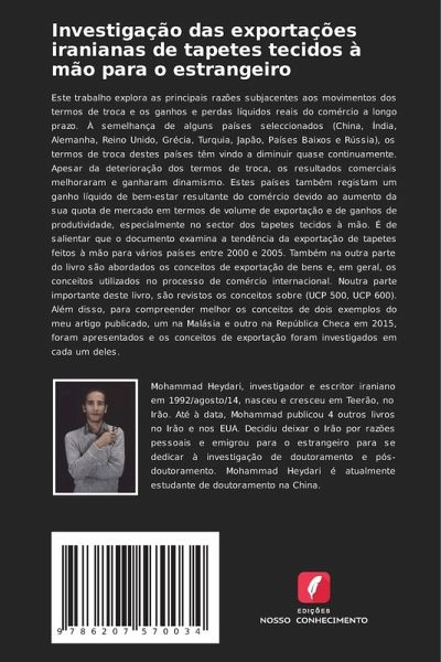 Este trabalho explora as principais razões subjacentes aos movimentos dos termos de troca e os ganhos e perdas líquidos reais do comércio a longo prazo. À semelhança de alguns países seleccionados (China, Índia, Alemanha, Reino Unido, Grécia, Turquia, Japão, Países Baixos e Rússia), os termos de troca destes países têm vindo a diminuir quase continuamente. Apesar da deterioração dos termos de troca, os resultados comerciais melhoraram e ganharam dinamismo. Estes países também registam um ganho líquido de bem-estar resultante do comércio devido ao aumento da sua quota de mercado em termos de volume de exportação e de ganhos de produtividade, especialmente no sector dos tapetes tecidos à mão. É de salientar que o documento examina a tendência da exportação de tapetes feitos à mão para vários países entre 2000 e 2005. Também na outra parte do livro são abordados os conceitos de exportação de bens e, em geral, os conceitos utilizados no processo de comércio internacional. Noutra parte importante deste livro, são revistos os conceitos sobre (UCP 500, UCP 600). Além disso, para compreender melhor os conceitos de dois exemplos do meu artigo publicado, um na Malásia e outro na República Checa em 2015, foram apresentados e os conceitos de exportação foram investigados em cada um deles.