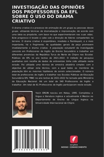 O drama criativo é o processo de animação de um grupo ou pessoas desse grupo, utilizando técnicas de dramatização e improvisação, de acordo com uma ideia ou propósito, com base no que experimentaram nas suas vidas. Este progresso é levado a cabo sob a direcção de líderes competentes no terreno. O drama criativo é espontâneo, imediato e flamboyant, e o mais importante, há o fingimento. As qualidades gerais da peça promovem imediatamente o drama criativo. A população estudantil da investigação consiste em Professores de Inglês do Ensino Secundário a trabalhar em diferentes províncias da República Turca do Norte de Chipre nas Escolas Públicas de EFL no ano lectivo de 2021-2022. O método de pesquisa qualitativa com recolha de dados de entrevistas tinha sido utilizado neste estudo. Foi utilizada uma técnica de amostra aleatória simples com o objectivo de utilizar esta técnica, com a qual todos os membros da população têm as mesmas hipóteses de serem seleccionados. O número total de professores de inglês a trabalhar nas Escolas Públicas de Educação Secundária EFL TRNC no ano lectivo de 2021-2022 foi tomado pelo Ministério da Educação Nacional. Há um total de 340 Professores de Inglês a trabalhar. Um total de 61 Professores de Inglês participaram neste estudo.