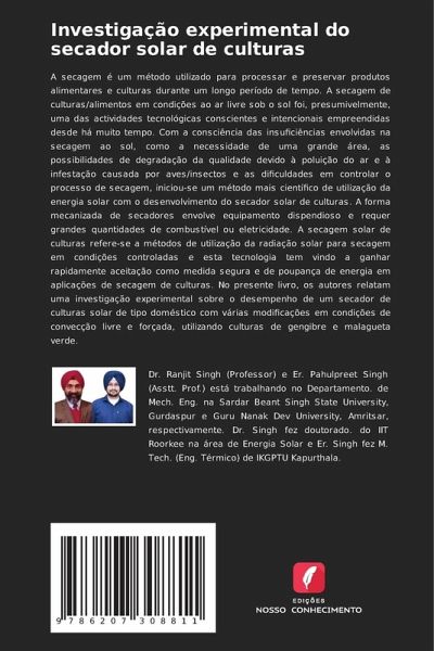 A secagem é um método utilizado para processar e preservar produtos alimentares e culturas durante um longo período de tempo. A secagem de culturas/alimentos em condições ao ar livre sob o sol foi, presumivelmente, uma das actividades tecnológicas conscientes e intencionais empreendidas desde há muito tempo. Com a consciência das insuficiências envolvidas na secagem ao sol, como a necessidade de uma grande área, as possibilidades de degradação da qualidade devido à poluição do ar e à infestação causada por aves/insectos e as dificuldades em controlar o processo de secagem, iniciou-se um método mais científico de utilização da energia solar com o desenvolvimento do secador solar de culturas. A forma mecanizada de secadores envolve equipamento dispendioso e requer grandes quantidades de combustível ou eletricidade. A secagem solar de culturas refere-se a métodos de utilização da radiação solar para secagem em condições controladas e esta tecnologia tem vindo a ganhar rapidamente aceitação como medida segura e de poupança de energia em aplicações de secagem de culturas. No presente livro, os autores relatam uma investigação experimental sobre o desempenho de um secador de culturas solar de tipo doméstico com várias modificações em condições de convecção livre e forçada, utilizando culturas de gengibre e malagueta verde.
