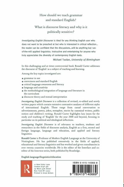 In this challenging and at times controversial book, Ronald Carter addresses the discourse of 'English' as a subject of teaching and learning. Among the key topics investigated are: * grammar * correctness and standard English * critical language awareness and literacy * language and creativity * the methodological integration of language and literature in the curriculum * discourse theory and textual interpretation. Investigating English Discourse is a collection of revised, re-edited and newly written papers which contain extensive contrastive analyses of different styles of international English. These range from casual conversation to advertisement, poetry, jokes, metaphor, stories by canonical writers, public notices and children's writing. Ronald Carter highlights key issues for the study and teaching of 'English' for the year 2000 and beyond, focusing in particular on its political and ideological inflections. Investigating English Discourse is of relevance to teachers and students and researchers in the fields of discourse analysis, English as a first, second and foreign language, language and education, applied and literary linguistics.