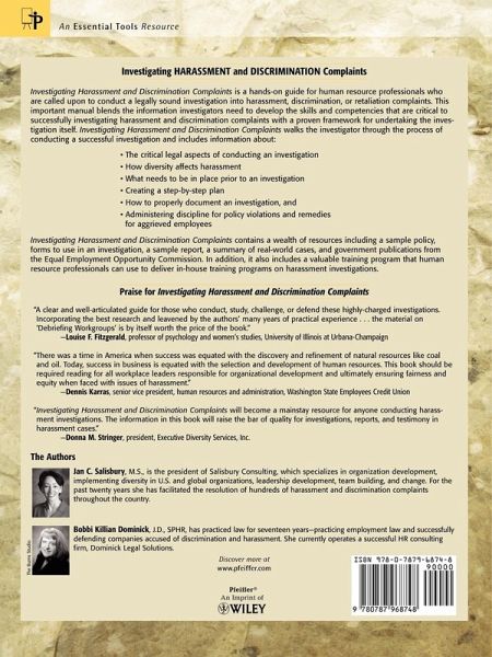Investigating Harassment and Discrimination Complaints is a hands-on guide for human resource professionals who are called upon to conduct a legally sound investigation into harassment, discrimination, or retaliation complaints. This important manual blends the information investigators need to develop the skills and competencies that are critical to successfully investigating harassment and discrimination complaints with a proven framework for undertaking the investigation itself. Investigating Harassment and Discrimination Complaint s walks the investigator through the process of conducting a successful investigation and includes information about:
