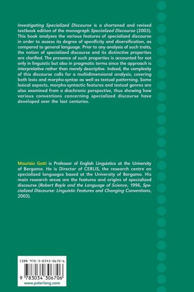 Investigating Specialized Discourse is a shortened and revised textbook edition of the monograph Specialized Discourse (2003). This book analyses the various features of specialized discourse in order to assess its degree of specificity and diversification, as compared to general language. Prior to any analysis of such traits, the notion of specialized discourse and its distinctive properties are clarified. The presence of such properties is accounted for not only in linguistic but also in pragmatic terms since the approach is interpretative rather than merely descriptive. Indeed, the complexity of this discourse calls for a multidimensional analysis, covering both lexis and morpho-syntax as well as textual patterning. Some lexical aspects, morpho-syntactic features and textual genres are also examined from a diachronic perspective, thus showing how various conventions concerning specialized discourse have developed over the last centuries.