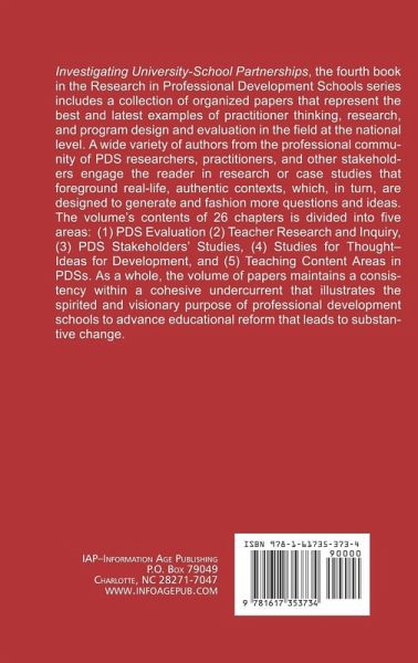 Investigating University-School Partnerships: A Volume in Professional Development School Research, the fourth book in the PDS Research Series developed by the same editors, includes a collection of organized papers that represent the best and latest examples of practitioner thinking, research, and program design and evaluation in the field at the national level. A wide variety of authors from the professional community of PDS researchers, practitioners, and other stakeholders engage the reader in research or case studies that foreground real-life, authentic contexts, which, in turn, are designed to generate and fashion more questions and ideas. The volume's contents of 26 chapters is divided into five areas: (1) PDS Evaluation (2) Teacher Research and Inquiry, (3) PDS Stakeholders' Studies, (4) Studies for Thought - Ideas for Development, and (5) Teaching Content Areas in PDSs. As a whole, the volume of papers maintains a consistency within a cohesive undercurrent that illustrates the spirited and visionary purpose of professional development schools to advance educational reform that leads to substantive change.