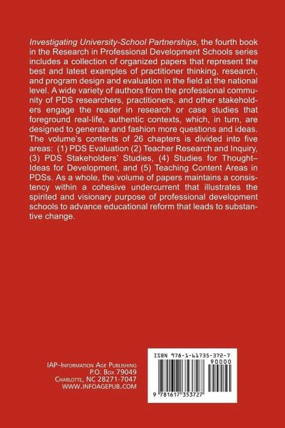 Investigating University-School Partnerships: A Volume in Professional Development School Research, the fourth book in the PDS Research Series developed by the same editors, includes a collection of organized papers that represent the best and latest examples of practitioner thinking, research, and program design and evaluation in the field at the national level. A wide variety of authors from the professional community of PDS researchers, practitioners, and other stakeholders engage the reader in research or case studies that foreground real-life, authentic contexts, which, in turn, are designed to generate and fashion more questions and ideas. The volume's contents of 26 chapters is divided into five areas: (1) PDS Evaluation (2) Teacher Research and Inquiry, (3) PDS Stakeholders' Studies, (4) Studies for Thought - Ideas for Development, and (5) Teaching Content Areas in PDSs. As a whole, the volume of papers maintains a consistency within a cohesive undercurrent that illustrates the spirited and visionary purpose of professional development schools to advance educational reform that leads to substantive change.