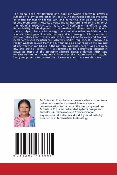 The global need for harmless and pure renewable energy is always a subject of foremost interest to the society. A continuous and steady source of energy for mankind is the Sun, and harvesting it helps in solving the energy requirement. However, conventional harvesting of solar energy by the help of photovoltaic cells has its own limitations on its efficiency, and its availability which depend on the weather conditions and the time of the day. Apart from solar energy there are also other available natural sources of energy such as wind energy, kinetic energy which make use of massive turbines and transformers which are subject to wear and tear and need continuous maintenance. Whereas, Radio Frequency (RF) energy is a readily available source from the surrounding air at anytime of the day and at any weather conditions. Although, the available energy levels are quite low and are not constant, it still remains to be a promising solution in powering many of the consumer-oriented portable devices, RFID tags, wireless sensors and many more. Moreover, this system does not require bulky components to convert the microwave energy to a usable power.