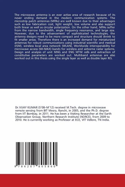The microwave antenna is an ever active area of research because of its never ending demand in the modern communication systems. The microstrip patch antennas (MPAs) are well known due to their advantages such as low fabrication cost, light weight, low volume and also support both linear as well as circular polarization. On the other hand, MPAs suffer from the narrow bandwidth, single frequency resonance, and large size. However, due to the advancement of sophisticated technologies, the antenna designs need to be more compact and structure should shrink to fit smaller areas. Therefore there is an increased demand for miniaturized antennas for robust communications using industrial scientific and medical (ISM), wireless local area network (WLAN), Worldwide interoperability for microwave access (Wi-MAX) bands for wireless and airborne radar systems. Design and analysis of unit MNG and ENG MTM cells and extraction of constitutive parameters are worked out. Multiband antennas are also worked out in this thesis using the single layer as well as double layer RIS.
