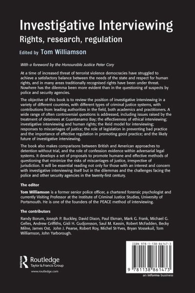 Part I: Developments in Rights 1. Investigative interviewing and human rights in the war on terrorism 2. Al-Qaeda-related subjects: a law enforcement perspective 3. American interrogation methods in the war on terror 4. The interrogation of terrorist suspects: the banality of torture Part II: Developments in Research 5. The psychology of rapport: five basic rules 6. Confessions by sex offenders 7. The psychology of interrogations and confessions 8. Towards greater professionalism: minimizing miscarriages of justice 9. Will it all end in tiers? Police interviews with suspects in Britain 10. The Reid Technique of interviewing and interrogation 11. A critical appraisal of the Reid Technique 12. Investigative interviewing and the detection of deception Part III: Developments in Regulation 13. Recovered memories 14. Investigative interviewing: suspects' and victims' rights in balance 15. Regulating police interrogation 16. Conclusion