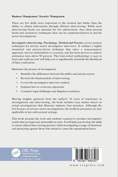 Investigative Interviewing: Psychology, Method and Practice covers modern techniques for private sector investigative interviews. It outlines a highly structured and process-driven technique that takes a non-accusatory approach, uses no intimidation or coercion, and has been proven to achieve admission rates above 90 percent. This time-tested methodology is easy to learn and replicate and will help you to significantly diminish the likelihood of false confessions.