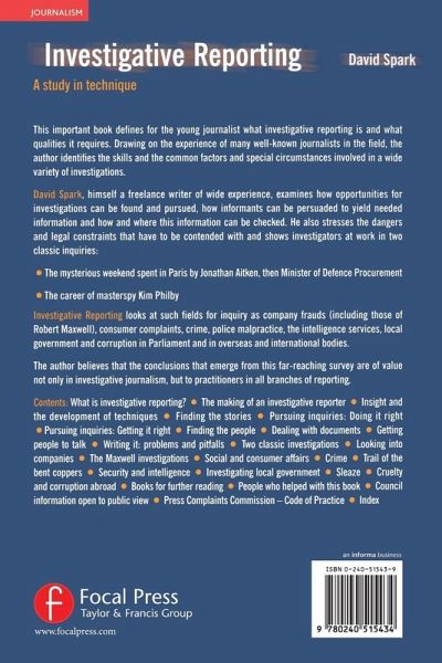 This important book defines what investigative reporting is and what qualities it requires. Drawing on the experience of many well-known journalists in the field, the author identifies the skills, common factors and special circumstances involved in a wide variety of investigations. It examines how opportunities for investigations can be found and pursued, how informants can be persuaded to yield needed information and how and where this information can be checked. It also stresses the dangers and legal constraints that have to be contended with and shows real life examples such as the Cook Report formula, the Jonathan Aitken investigation and the Birmingham Six story. David Spark, himself a freelance writer of wide experience, examines how opportunities for investigations can be found and pursued, how informants can be persuaded to yield needed information and how and where this information can be checked. He also stresses the dangers and legal constraints that have to be contended with and shows investigators at work in two classic inquiries: · The mysterious weekend spent in Paris by Jonathan Aitken, then Minister of Defence Procurement· The career of masterspy Kim PhilbyInvestigative Reporting looks at such fields for inquiry as company frauds (including those of Robert Maxwell), consumer complaints, crime, police malpractice, the intelligence services, local government and corruption in Parliament and in overseas and international bodies.The author believes that the conclusions that emerge from this far-reaching survey are of value not only in investigative journalism, but to practitioners in all branches of reporting.