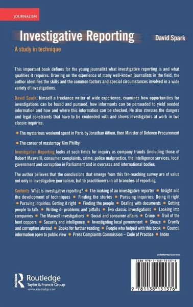This important book defines what investigative reporting is and what qualities it requires. Drawing on the experience of many well-known journalists in the field, the author identifies the skills, common factors and special circumstances involved in a wide variety of investigations. It examines how opportunities for investigations can be found and pursued, how informants can be persuaded to yield needed information and how and where this information can be checked. It also stresses the dangers and legal constraints that have to be contended with and shows real life examples such as the Cook Report formula, the Jonathan Aitken investigation and the Birmingham Six story. David Spark, himself a freelance writer of wide experience, examines how opportunities for investigations can be found and pursued, how informants can be persuaded to yield needed information and how and where this information can be checked. He also stresses the dangers and legal constraints that have to be contended with and shows investigators at work in two classic inquiries: · The mysterious weekend spent in Paris by Jonathan Aitken, then Minister of Defence Procurement· The career of masterspy Kim PhilbyInvestigative Reporting looks at such fields for inquiry as company frauds (including those of Robert Maxwell), consumer complaints, crime, police malpractice, the intelligence services, local government and corruption in Parliament and in overseas and international bodies.The author believes that the conclusions that emerge from this far-reaching survey are of value not only in investigative journalism, but to practitioners in all branches of reporting.