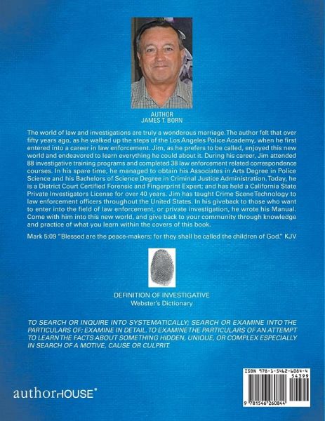 The world of law and investigations are truly a wonderous marriage. The author felt that over fifty years ago, as he walked up the steps of the Los Angeles Police Academy, when he first entered into a career in law enforcement. Jim, as he prefers to be called, enjoyed this new world and endeavored to learn everything he could about it. During his career, Jim attended 88 investigative training programs and completed 38 law enforcement related correspondence courses. In his spare time, he managed to obtain his Associates in Arts Degree in Police Science and his Bachelors of Science Degree in Criminal Justice Administration. Today, he is a District Court Certified Forensic and Fingerprint Expert; and has held a California State Private Investigators License for over 40 years. Jim has taught Crime Scene Technology to law enforcement officers throughout the United States. In his giveback to those who want to enter into the field of law enforcement, or private investigation, he wrote his Manual. Come with him into this new world, and give back to your community through knowledge and practice of what you learn within the covers of this book. Mark 5:09 "Blessed are the peace-makers: for they shall be called the children of God." KJV