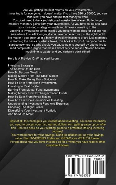 Are you getting the best returns on your investments? Investing is for everyone. It doesn't matter if you have $20 or $5000; you can take what you have and put that money to work. You don't need to be a sophisticated investor like Warren Buffet to get massive monetary gains from your investments. All you have to do is to base your investing strategy on math and timeless investing truths. Looking to invest some of the money you have worked ages for but are not sure where to start? Congrats! You have come across just the right book! No matter if you grew up in a family of wealthy investors or are just interested in learning the basics of what it takes, this book is for you! Everyone has to start somewhere, so why should you cause pain to yourself by attempting to read complicated jargon that makes absolutely no sense? No one has that much time to waste, and you certainly don't either! Here Is A Preview Of What You'll Learn... Investing Strategies The Secrets Of The Rich How To Become Wealthy Making Money From The Stock Market How To Make Money From Dividends How To Earn From Bond Investments Investing In Real Estate Earning From Mutual Fund Investments Making Money From Exchange-Traded Funds How To Earn From Forex Trading How To Earn From Commodities Investing Understanding Investment Fees And Expenses Choosing The Right Broker Diversifying Your Investment Portfolio And So Much More! Best of all, this book gets you excited about investing. You learn the basics you need to protect your hard earned dollars from getting eaten up by inflation. Use this book as your starting guide to a profitable lifelong investing journey! You worked hard for your savings. Don't let inflation eat up your savings' value. Start INVESTING Today and GROW your WEALTH forever. Forget about how you have invested so far or what you have read in other investment books. Download your copy today! Take action today and download this book now