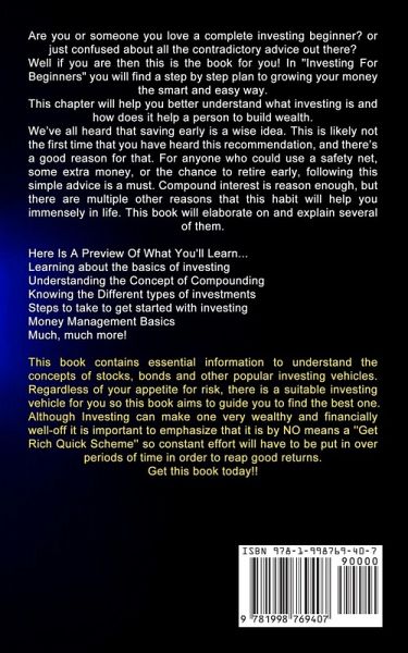 Are you or someone you love a complete investing beginner? or just confused about all the contradictory advice out there? Well if you are then this is the book for you! In "Investing For Beginners" you will find a step by step plan to growing your money the smart and easy way. This chapter will help you better understand what investing is and how does it help a person to build wealth. We've all heard that saving early is a wise idea. This is likely not the first time that you have heard this recommendation, and there's a good reason for that. For anyone who could use a safety net, some extra money, or the chance to retire early, following this simple advice is a must. Compound interest is reason enough, but there are multiple other reasons that this habit will help you immensely in life. This book will elaborate on and explain several of them. Here Is A Preview Of What You'll Learn...Learning about the basics of investing Understanding the Concept of Compounding Knowing the Different types of investments Steps to take to get started with investing Money Management Basics Much, much more! This book contains essential information to understand the concepts of stocks, bonds and other popular investing vehicles. Regardless of your appetite for risk, there is a suitable investing vehicle for you so this book aims to guide you to find the best one. Although Investing can make one very wealthy and financially well-off it is important to emphasize that it is by NO means a ''Get Rich Quick Scheme'' so constant effort will have to be put in over periods of time in order to reap good returns. Get this book today!!