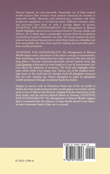 Investing for Sustainability: The Management of Mineral Wealth begins with a discussion of the elusive concept of sustainability. New technology and substitution has made a resource like peat obsolete long before it became exhausted physically. Jevons' famous book "The Coal Question" is discussed at some length as a case of unwarranted concern about the depletion of resources. The book also highlights other cases which strike a less happy note. Nauru, one of the smallest sovereign states in the world, has for decades lived off phosphate resources that are now running out. Nauru attempted to make its phosphate wealth permanent through investment funds but failed.