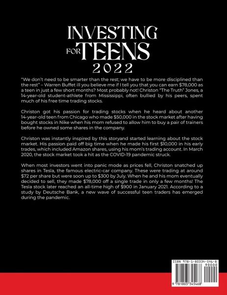 "We don't need to be smarter than the rest; we have to be more disciplined than the rest" - Warren Buffet ill you believe me if I tell you that you can earn $78,000 as a teen in just a few short months? Most probably not! Christon "The Truth" Jones, a 14-year-old student-athlete from Mississippi, often bullied by his peers, spent much of his free time trading stocks. Christon got his passion for trading stocks when he heard about another 14-year-old teen from Chicago who made $50,000 in the stock market after having bought stocks in Nike when his mom refused to allow him to buy a pair of trainers before he owned some shares in the company. Christon was instantly inspired by this storyand started learning about the stock market. His passion paid off big time when he made his first $10,000 in his early trades, which included Amazon shares, using his mom's trading account. In March 2020, the stock market took a hit as the COVID-19 pandemic struck.When most investors went into panic mode as prices fell, Christon snatched up shares in Tesla, the famous electric-car company. These were trading at around $72 per share but were soon up to $300 by July. When he and his mom eventually decided to sell, they made $78,000 off a single trade in only a few months! The Tesla stock later reached an all-time high of $900 in January 2021. According to a study by Deutsche Bank, a new wave of successful teen traders has emerged during the pandemic.