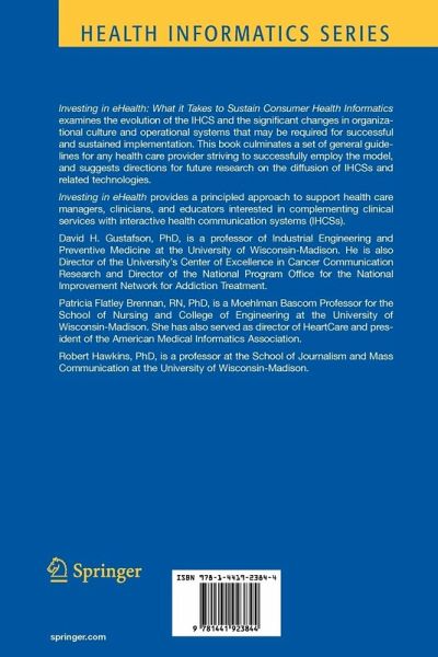 As the Internet's presence in health care grows more pervasive, an increasing number of health care providers have begun to implement eHealth innovations in their practice. The interactive health communication system (IHCS), one such eHealth solution, provides consumers with information, informal support, and a venue for communication. Investing in eHealth: What it Takes to Sustain Consumer Health Informatics examines the evolution of the IHCS and the significant changes in organizational culture and operational systems that may be required for successful and sustained implementation.