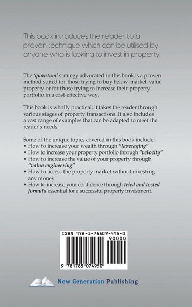 This book introduces the reader to a proven technique which can be utilised by anyone who is looking to invest in property. The 'quantum' strategy advocated in this book is a proven method suited for those trying to buy below-market-value property or for those trying to increase their property portfolio in a cost-effective way. This book is wholly practical: it takes the reader through various stages of property transactions. It also includes a vast range of examples that can be adapted to meet the reader's needs. Some of the unique topics covered in this book include: How to increasing your wealth through "leveraging" How to increasing your property portfolio through "velocity" How to increasing the value of your property through "value engineering" How to access the property market without investing any money How to increasing your confidence through tried and tested formula essential for a successful property investment.
