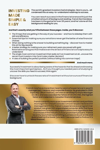 Investing Made Simple and EasyThe 35 essential personal finance, wealth management, and trading tips that pro should share The world's greatest investors had strategies. Here's yours... all condensed into an easy-to-understand roadmap to success. Do you have discipline and patience? Then you have two of the key skills that made Warren Buffet the billionaire he is today. It's difficult not to look at the field of investment and wealth management and think there's too much to learn to make a success of it... and indeed, there are a great many in-depth books out there that make it seem even more daunting. You could study finance to a deep level for years, and still continue to learn something new. But do you really need to? Thankfully, the answer is no. There are shortcuts, and these shortcuts rely on using the work of others who've gone before you. Franck Normandeau has been in the game for over 20 years, and he's done all the background reading for you. So if you have a thirst for reaping the rewards of investment but lack the passion for trawling through heavy finance literature, you're in luck. You can see success in the financial arena with just the smallest amount of background reading - all you need is someone to pinpoint the most important points for you and condense them into digestible, easy-to-manage nuggets of wisdom. And that's exactly what you'll find between these pages. Inside, you'll discover: ¿ The 9 traps that are getting in the way of your success - and how to sidestep them with skill and efficiency ¿ Essential tips for making sure your emotions never get the better of wise financial choices ¿ When doing nothing is the answer to building something big - discover how to master this art for big rewards ¿ What the system doesn't want you to know about pension plans - and a better strategy for making sure your retirement years are paved with gold ¿ Relatable analogies that make even the driest of financial concepts easy to understand ¿ The single most common investment that really isn't an investment at all... uncover the secret most investors miss (and make a better decision) ¿ 4 rules of building the perfect portfolio (without falling into common traps) And much more. Successful investment is about being aware of the hazards that lie ahead and knowing the most important gameplays... So if you thought you needed years of studying to uncover the skills you need to succeed, think again. All you need is someone to boil it all down to its very essence - the most important things you need to know to open the doors to success. And lucky for you, someone's done just that...