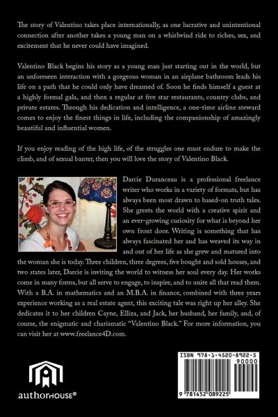 The story of Valentino takes place internationally, as one lucrative and unintentional connection after another takes a young man on a whirlwind ride to riches, sex, and excitement that he never could have imagined. Valentino Black begins his story as a young man just starting out in the world, but an unforeseen interaction with a gorgeous woman in an airplane bathroom leads his life on a path that he could only have dreamed of. Soon he finds himself a guest at a highly formal gala, and then a regular at five star restaurants, country clubs, and private estates. Through his dedication and intelligence, a one-time airline steward comes to enjoy the finest things in life, including the companionship of amazingly beautiful and influential women. If you enjoy reading of the high life, of the struggles one must endure to make the climb, and of sexual banter, then you will love the story of Valentino Black.