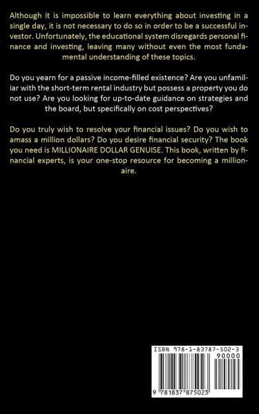 Although it is impossible to learn everything about investing in a single day, it is not necessary to do so in order to be a successful investor. Unfortunately, the educational system disregards personal finance and investing, leaving many without even the most fundamental understanding of these topics. Do you yearn for a passive income-filled existence? Are you unfamiliar with the short-term rental industry but possess a property you do not use? Are you looking for up-to-date guidance on strategies and the board, but specifically on cost perspectives? Do you truly wish to resolve your financial issues? Do you wish to amass a million dollars? Do you desire financial security? The book you need is MILLIONAIRE DOLLAR GENUISE. This book, written by financial experts, is your one-stop resource for becoming a millionaire.