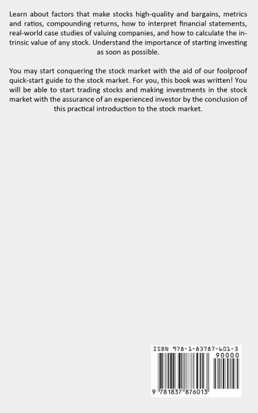 Learn about factors that make stocks high-quality and bargains, metrics and ratios, compounding returns, how to interpret financial statements, real-world case studies of valuing companies, and how to calculate the intrinsic value of any stock. Understand the importance of starting investing as soon as possible. You may start conquering the stock market with the aid of our foolproof quick-start guide to the stock market. For you, this book was written! You will be able to start trading stocks and making investments in the stock market with the assurance of an experienced investor by the conclusion of this practical introduction to the stock market.