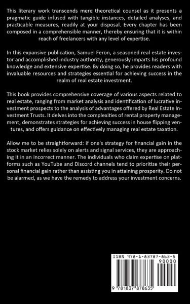 This literary work transcends mere theoretical counsel as it presents a pragmatic guide infused with tangible instances, detailed analyses, and practicable measures, readily at your disposal. Every chapter has been composed in a comprehensible manner, thereby ensuring that it is within reach of freelancers with any level of expertise. In this expansive publication, Samuel Feron, a seasoned real estate investor and accomplished industry authority, generously imparts his profound knowledge and extensive expertise. By doing so, he provides readers with invaluable resources and strategies essential for achieving success in the realm of real estate investment. This book provides comprehensive coverage of various aspects related to real estate, ranging from market analysis and identification of lucrative investment prospects to the analysis of advantages offered by Real Estate Investment Trusts. It delves into the complexities of rental property management, demonstrates strategies for achieving success in house flipping ventures, and offers guidance on effectively managing real estate taxation. Allow me to be straightforward: if one's strategy for financial gain in the stock market relies solely on alerts and signal services, they are approaching it in an incorrect manner. The individuals who claim expertise on platforms such as YouTube and Discord channels tend to prioritize their personal financial gain rather than assisting you in attaining prosperity. Do not be alarmed, as we have the remedy to address your investment concerns.