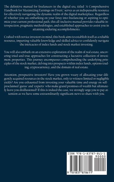 The definitive manual for freelancers in the digital era, titled 'A Comprehensive Handbook for Maximizing Earnings on Fiverr,' serves as an indispensable resource for effectively navigating the dynamic realm of the digital marketplace. Regardless of whether you are embarking on your foray into freelancing or aspiring to optimize your current professional path, this all-inclusive manual provides valuable introspection, pragmatic methodologies, and established approaches to assist you in attaining enduring accomplishments. Crafted with novice investors in mind, this book aims to establish itself as a reliable resource, imparting valuable knowledge and skilled advice to confidently navigate the intricacies of index funds and stock market investing. You will also embark on an extensive exploration of the realm of real estate, uncovering tried-and-true approaches for constructing a lucrative collection of investment properties. This journey encompasses comprehending the underlying principles of the stock market, delving into prospects within index funds, options trading, cryptocurrency, and the domain of real estate. Attention, prospective investors! Have you grown weary of allocating your diligently acquired resources in the stock market, only to witness limited or negligible yields? Are you exhausted from investing your valuable time and energy on self-proclaimed 'gurus' and 'experts' who make grand promises of wealth but ultimately leave you disillusioned? If this is indeed the case, we strongly urge you to pay attention as we have some extraordinarily significant news to share with you.