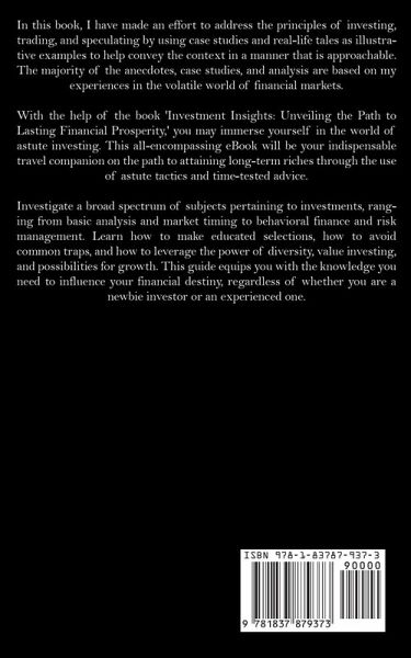 In this book, I have made an effort to address the principles of investing, trading, and speculating by using case studies and real-life tales as illustrative examples to help convey the context in a manner that is approachable. The majority of the anecdotes, case studies, and analysis are based on my experiences in the volatile world of financial markets. With the help of the book 'Investment Insights: Unveiling the Path to Lasting Financial Prosperity,' you may immerse yourself in the world of astute investing. This all-encompassing eBook will be your indispensable travel companion on the path to attaining long-term riches through the use of astute tactics and time-tested advice. Investigate a broad spectrum of subjects pertaining to investments, ranging from basic analysis and market timing to behavioral finance and risk management. Learn how to make educated selections, how to avoid common traps, and how to leverage the power of diversity, value investing, and possibilities for growth. This guide equips you with the knowledge you need to influence your financial destiny, regardless of whether you are a newbie investor or an experienced one.