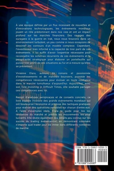 IÀ une époque définie par un flux incessant de nouvelles et d'innovations technologiques, les événements mondiaux jouent un rôle prédominant dans nos vies et ont un impact profond sur les marchés financiers. Des ravages causés par les ouragans à la guerre en Irak, nous nous trouvons dans un environnement turbulent, un peu comme si nous essayions de dessiner les contours d'un modèle complexe. Cependant, l'investisseur bien informé a la capacité de tirer parti de ces événements. La seule condition est d'avoir l'expertise nécessaire pour reconnaître les schémas récurrents dans ces événements et la perspicacité stratégique pour développer un portefeuille capable de tirer profit de ces situations lorsqu'elles se présentent. Vivienne Elara, auteur de romans et passionnée d'investissements et de marchés boursiers, possède les compétences nécessaires pour évoluer en toute confiance sur le marché tumultueux d'aujourd'hui. Aujourd'hui, avec son livre Investing in Difficult Times, elle souhaite partager ces compétences avec vous. Rempli d'analyses perspicaces et de conseils concrets, ce livre explore l'histoire des principaux événements mondiaux qui ont bouleversé l'économie et propose des tactiques pratiques pour un trading rentable sur chacun d'entre eux. À l'aide d'exemples réels, Elara vous aide à lire les tendances du marché et à prédire les mouvements les plus lucratifs. Elle révèle également des détails peu connus sur les succès du trading événementiel, démontrant comment tout trader peut les imiter dans différents contextes de marché.