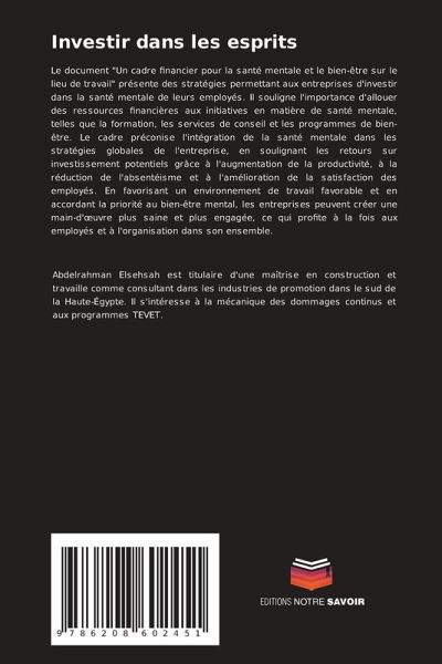 Le document "Un cadre financier pour la santé mentale et le bien-être sur le lieu de travail" présente des stratégies permettant aux entreprises d'investir dans la santé mentale de leurs employés. Il souligne l'importance d'allouer des ressources financières aux initiatives en matière de santé mentale, telles que la formation, les services de conseil et les programmes de bien-être. Le cadre préconise l'intégration de la santé mentale dans les stratégies globales de l'entreprise, en soulignant les retours sur investissement potentiels grâce à l'augmentation de la productivité, à la réduction de l'absentéisme et à l'amélioration de la satisfaction des employés. En favorisant un environnement de travail favorable et en accordant la priorité au bien-être mental, les entreprises peuvent créer une main-d'oeuvre plus saine et plus engagée, ce qui profite à la fois aux employés et à l'organisation dans son ensemble.