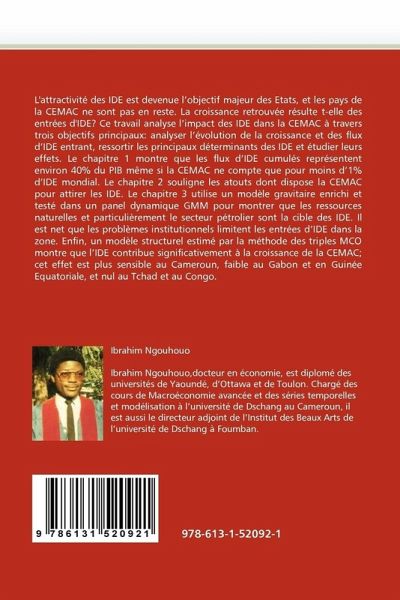 L'attractivité des IDE est devenue l'objectif majeur des Etats, et les pays de la CEMAC ne sont pas en reste. La croissance retrouvée résulte t-elle des entrées d'IDE? Ce travail analyse l'impact des IDE dans la CEMAC à travers trois objectifs principaux: analyser l'évolution de la croissance et des flux d'IDE entrant, ressortir les principaux déterminants des IDE et étudier leurs effets. Le chapitre 1 montre que les flux d'IDE cumulés représentent environ 40% du PIB même si la CEMAC ne compte que pour moins d'1% d'IDE mondial. Le chapitre 2 souligne les atouts dont dispose la CEMAC pour attirer les IDE. Le chapitre 3 utilise un modèle gravitaire enrichi et testé dans un panel dynamique GMM pour montrer que les ressources naturelles et particulièrement le secteur pétrolier sont la cible des IDE. Il est net que les problèmes institutionnels limitent les entrées d'IDE dans la zone. Enfin, un modèle structurel estimé par la méthode des triples MCO montre que l'IDE contribue significativement à la croissance de la CEMAC; cet effet est plus sensible au Cameroun, faible au Gabon et en Guinée Equatoriale, et nul au Tchad et au Congo.