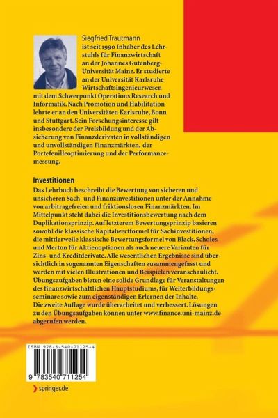 Das Lehrbuch beschreibt die Bewertung von sicheren und unsicheren Sach- und Finanzinvestitionen unter der Annahme von arbitragefreien und friktionslosen Finanzmärkten. Im Mittelpunkt steht dabei die Investitionsbewertung nach dem Duplikationsprinzip. Auf letzterem Bewertungsprinzip basieren sowohl die klassische Kapitalwertformel für Sachinvestitionen, die mittlerweile klassische Bewertungsformel von Black, Scholes und Merton für Aktienoptionen als auch neuere Varianten für Zins- und Kreditderivate. Alle wesentlichen Ergebnisse sind übersichtlich in sogenannten Eigenschaften zusammengefasst und werden mit vielen Illustrationen und Beispielen veranschaulicht. Übungsaufgaben bieten eine solide Grundlage für Veranstaltungen des finanzwirtschaftlichen Hauptstudiums, für Weiterbildungsseminare sowie zum eigenständigen Erlernen der Inhalte. Die zweite Auflage wurde überarbeitet und verbessert. Lösungen zu den Übungsaufgaben können unter www.finance.uni-mainz.de abgerufen werden.