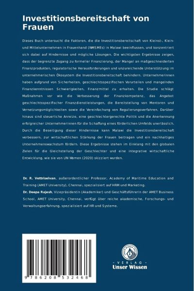 Dieses Buch untersucht die Faktoren, die die Investitionsbereitschaft von Kleinst-, Klein- und Mittelunternehmen in Frauenhand (WMSMEs) in Malawi beeinflussen, und konzentriert sich dabei auf Hindernisse und mögliche Lösungen. Die wichtigsten Ergebnisse zeigen, dass der begrenzte Zugang zu formeller Finanzierung, der Mangel an maßgeschneiderten Finanzprodukten, regulatorische Herausforderungen und unzureichende Unterstützung im unternehmerischen Ökosystem die Investitionsbereitschaft behindern. Unternehmerinnen haben aufgrund von Sicherheiten, geschlechtsspezifischen Vorurteilen und mangelnden Finanzkenntnissen Schwierigkeiten, Finanzmittel zu erhalten. Die Studie schlägt Maßnahmen vor wie die Verbesserung der Finanzkompetenz, das Angebot geschlechtsspezifischer Finanzdienstleistungen, die Bereitstellung von Mentoren und Vernetzungsmöglichkeiten sowie die Vereinfachung von Regulierungsverfahren. Darüber hinaus sind steuerliche Anreize, eine geschlechtergerechte Politik und die Anerkennung erfolgreicher Unternehmerinnen für die Schaffung eines förderlichen Umfelds unerlässlich. Durch die Beseitigung dieser Hindernisse kann Malawi die Investitionsbereitschaft verbessern, zur wirtschaftlichen Stärkung der Frauen beitragen und ein nachhaltiges Unternehmenswachstum fördern. Diese Ergebnisse stehen im Einklang mit den globalen Zielen für die Gleichstellung der Geschlechter und eine integrative wirtschaftliche Entwicklung, wie sie von UN Women (2020) skizziert wurden.