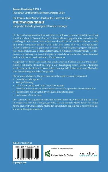 Den Lesern wird ein ganzheitliches und strukturiertes Prozessmodell für den Investitionsgütereinkauf zur Verfügung gestellt. Das umfassende Methodenset mit seinen zahlreichen Instrumenten und Methoden unterstützt beim Aufbau eines professionellen Investitionsgütereinkaufs.