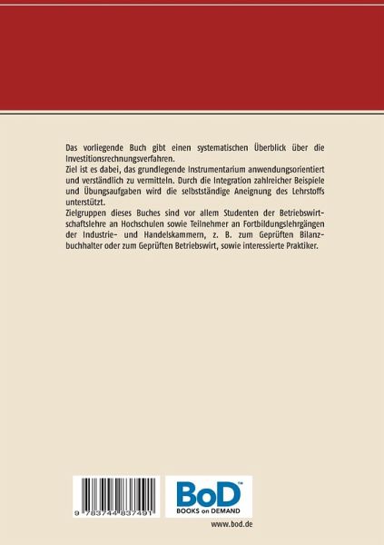 Das vorliegende Buch gibt einen systematischen Überblick über die Investitionsrechnungsverfahren.Ziel ist es dabei, das grundlegende Instrumentarium anwendungsorientiert und verständlich zu vermitteln. Durch die Integration zahlreicher Beispiele und Übungsaufgaben wird die selbstständige Aneignung des Lehrstoffs unterstützt.Zielgruppen dieses Buches sind vor allem Studenten der Betriebswirtschaftslehre an Hochschulen sowie Teilnehmer an Fortbildungslehrgängen der Industrie- und Handelskammern, z. B. zum Geprüften Bilanzbuchhalter oder zum Geprüften Betriebswirt, sowie interessierte Praktiker.Es werden alle wesentlichen Methoden der Investitionsrechnung im Überblick dargestellt, um dem Charakter einer Kompaktdarstellung gerecht zu werden.