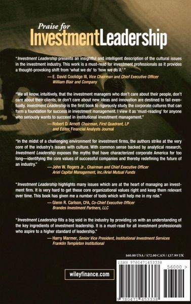PART ONE: Foundation Pieces: Cornerstones of Long-Term Success. CHAPTER 1: Leadership and Culture in the Investment Industry. CHAPTER 2: Core Values. CHAPTER 3: Vision: Where Are We Going? CHAPTER 4: Strong Cultures. PART TWO: Assessment Tools: Putting Numbers to the Soft Stuff. CHAPTER 5: Leader Types. CHAPTER 6: Measuring Culture. CHAPTER 7: Diagnosing Culture by Measuring Values. CHAPTER 8: Leadership and Trust. PART THREE: Getting Practical: Specific Tools for Improvement. CHAPTER 9: Ambitious Goals and Implementation. CHAPTER 10: The Innovative Culture. CHAPTER 11: Compensation and Ownership. CHAPTER 12: Homegrown Leadership. PART FOUR: Putting It All Together: Case Study. CHAPTER 13: The Best of the Best: Ariel Capital. CHAPTER 14: Continuous Improvement. PART FIVE: Other Audiences. CHAPTER 15: Consultant's View.. CHAPTER 16: Stock Picker's Corner: Rounding up the Un-Usual Suspects. NOTES. INDEX.