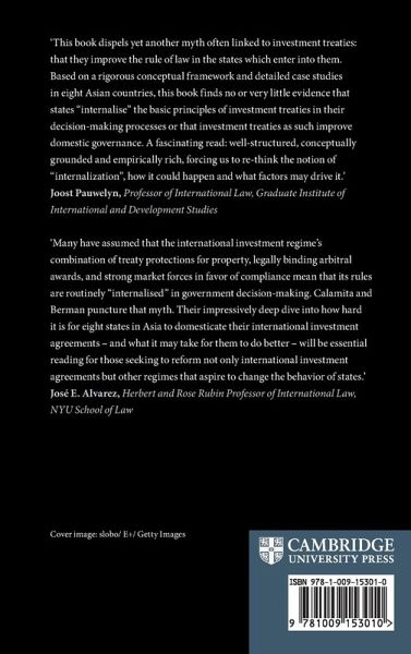 Investment treaties are said to improve the rule of law in the states which enter into them. Fearing claims, governments will internalise international investment obligations into their decision-making processes, resulting in positive spill-over effects on the rule of law. Such arguments have never been backed by empirical research. This book presents an analytical framework for thinking about the internalisation of international commitments in governmental decision making that takes account of the complexities of governance. In so doing, it provides a typology of processes whereby international treaty obligations may be internalised by governments and identifies factors which may affect whether and to what extent international commitments are internalised in governmental decision making. This framework serves as the background for the main body of the book in which empirical case studies address whether and how a select group of governments in Asia internalise international investment treaty obligations in their decision-making.