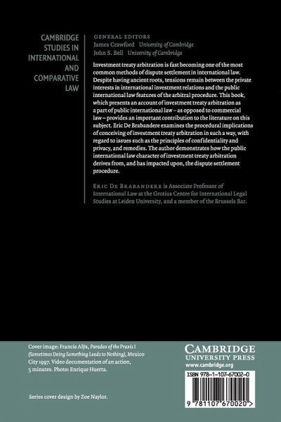 Investment treaty arbitration is fast becoming one of the most common methods of dispute settlement in international law. Despite having ancient roots, tensions remain between the private interests in international investment relations and the public international law features of the arbitral procedure. This book, which presents an account of investment treaty arbitration as a part of public international law - as opposed to commercial law - provides an important contribution to the literature on this subject. Eric De Brabandere examines the procedural implications of conceiving of investment treaty arbitration in such a way, with regard to issues such as the principles of confidentiality and privacy, and remedies. The author demonstrates how the public international law character of investment treaty arbitration derives from, and has impacted upon, the dispute settlement procedure.