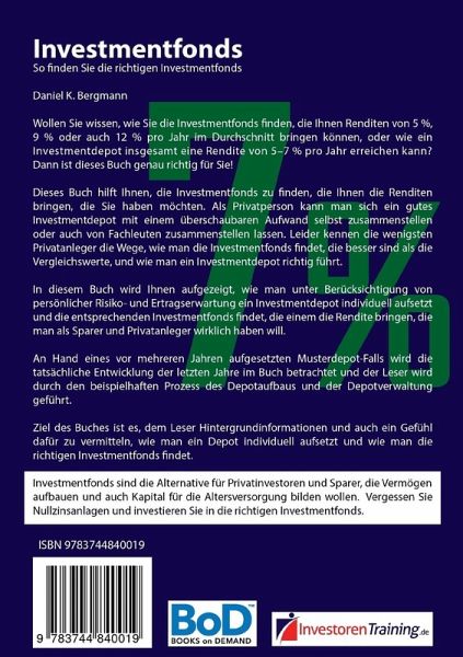 Wollen Sie wissen, wie Sie die Investmentfonds finden, die Ihnen Renditen von 5 %, 9 % oder auch 12 % pro Jahr im Durchschnitt bringen können, oder wie ein Investmentdepot insgesamt eine Rendite von 5 bis 7 % pro Jahr erreichen kann? Dann ist dieses Buch genau richtig für Sie!Dieses Buch hilft Ihnen, die Investmentfonds zu finden, die Ihnen die Renditen bringen, die Sie haben möchten. Als Privatperson kann man sich ein gutes Investmentdepot mit einem überschaubaren Aufwand selbst zusammenstellen oder auch von Fachleuten zusammenstellen lassen. Leider kennen die wenigsten Privatanleger die Wege, wie man die Investmentfonds findet, die besser sind als die Vergleichswerte, und wie man ein Investmentdepot richtig führt.In diesem Buch wird Ihnen aufgezeigt, wie man unter Berücksichtigung von persönlicher Risiko- und Ertragserwartung ein Investmentdepot individuell aufsetzt und die entsprechenden Investmentfonds findet, die einem die Rendite bringen, die man als Sparer und Privatanleger wirklich haben will.Anhand eines vor mehreren Jahren aufgesetzten Musterdepot-Falls wird die tatsächliche Entwicklung der letzten Jahre im Buch betrachtet und der Leser wird durch den beispielhaften Prozess des Depotaufbaus und der Depotverwaltung geführt. Ziel des Buches ist es, dem Leser Hintergrundinformationen und auch ein Gefühl dafür zu vermitteln, wie man ein Depot individuell aufsetzt und wie man die richtigen Investmentfonds findet. Investmentfonds sind die Alternative für Privatinvestoren und Sparer, die Vermögen aufbauen und auch Kapital für die Altersversorgung bilden wollen. Vergessen Sie Nullzinsanlagen und investieren Sie in die richtigen Investmentfonds.